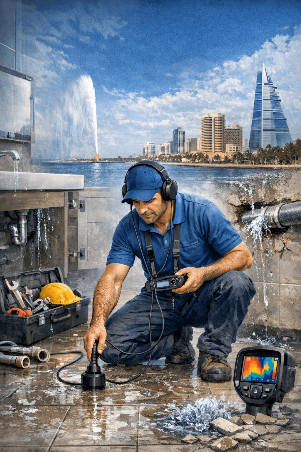 يشمل معاينة الأعراض، فحص مناطق الاشتباه (حمام/مطبخ/سطح/خزان)، واختبارات فنية تساعد في تحديد مصدر التسرب، ثم توضيح النتائج والتوصيات.
